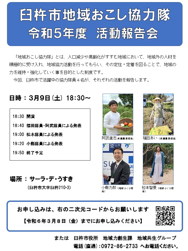公開日 2024年3月4日 更新日 2024年2月29日 地域おこし協力隊 活動報告会を行います。 「地域おこし協力隊」とは、人口減少や高齢化がすすむ地域において、地域外の人材を積極的に 受け入れ、地域協力活動を行ってもらい、その定住・定着を図ることで、地域の力を維持・強化して いく事を目的とした制度です。今回、臼杵市で活躍中の協力隊員4名が、それぞれの活動を報告します。 この機会に、ぜひご参加ください。 お問合せ 地域力創生課