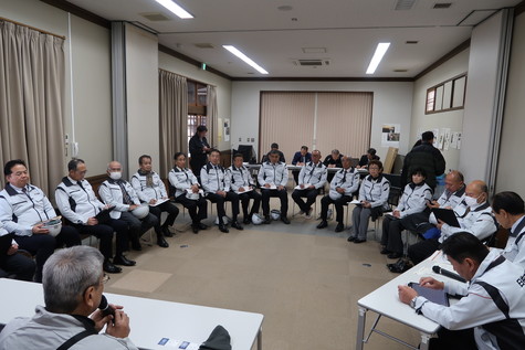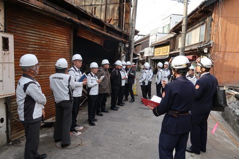 現地では、臼杵市消防本部の職員より、火災時の消火活動の状況説明を受けたのち、被災された臼杵市中央通り商店街の方々と、火災後の現状や今後に向けた困りごとなどについて、意見交換会を開催しました。