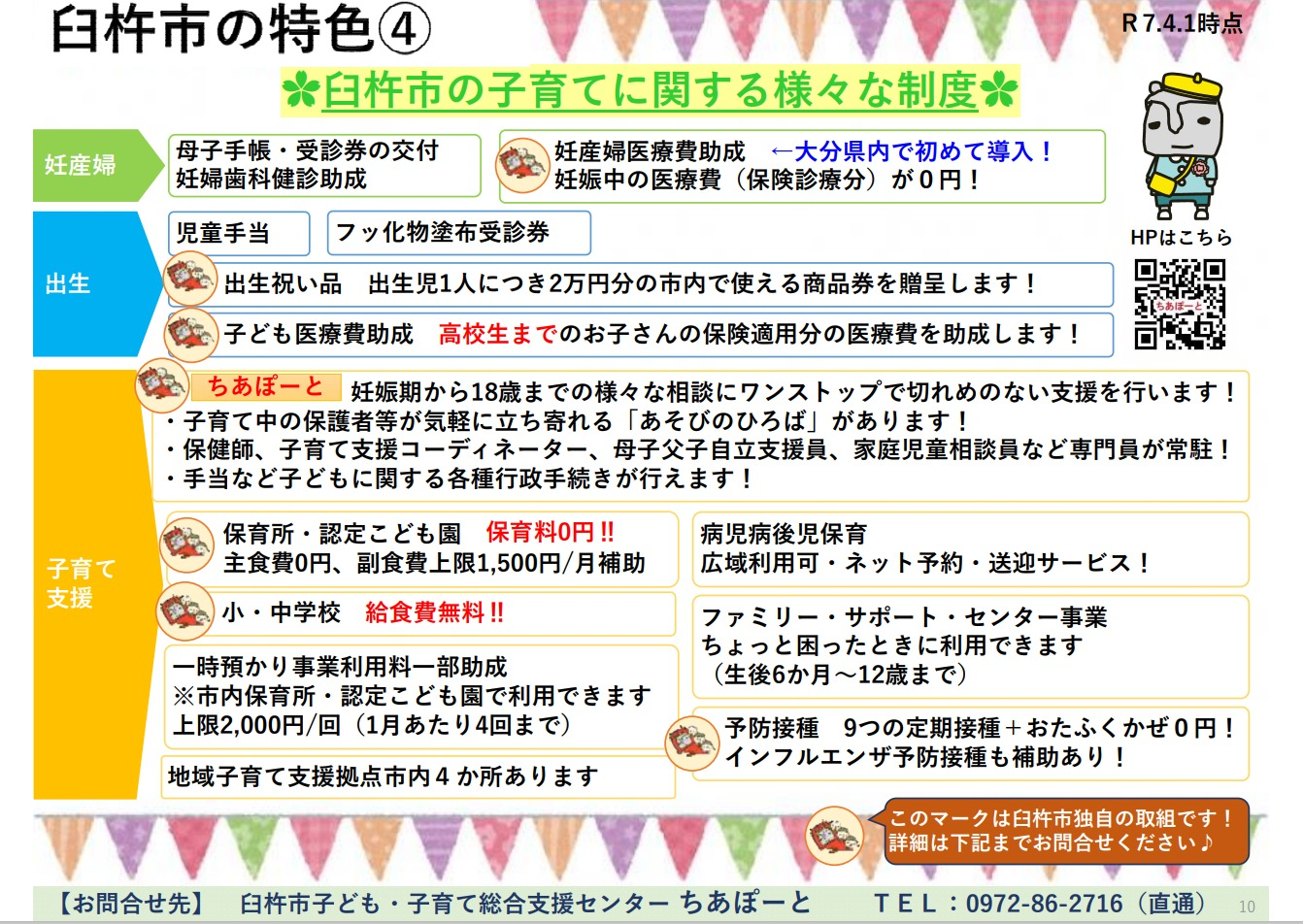 ・臼杵市は子育て支援が充実!保育園の待機児童ゼロ、保育料や小中学校の給食費および高校生までの医療費(入院・通院)が無料です。